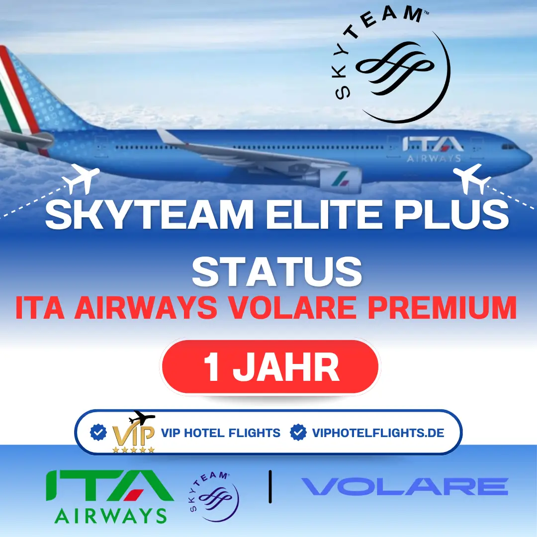 Mit unserem VIP Hotel Flights Express-Service erhalten Sie den SkyTeam Elite Plus ITA Airways Volare Premium Status für 1 Jahrganz ohne Statusmatch oder Punkte sammeln.